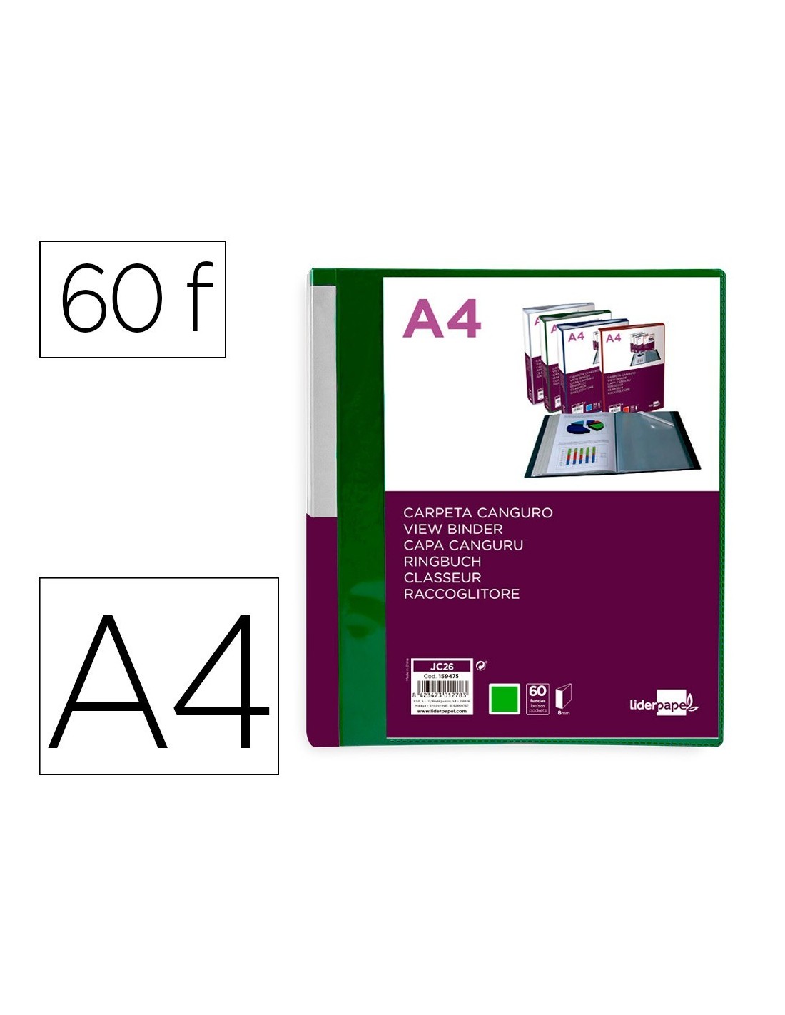 CARPETA LIDERPAPEL 60 FUNDAS CANGURO PP DIN A4 VERDE TRANSLUCIDO PORTADA Y LOMO PERSONALIZABLE