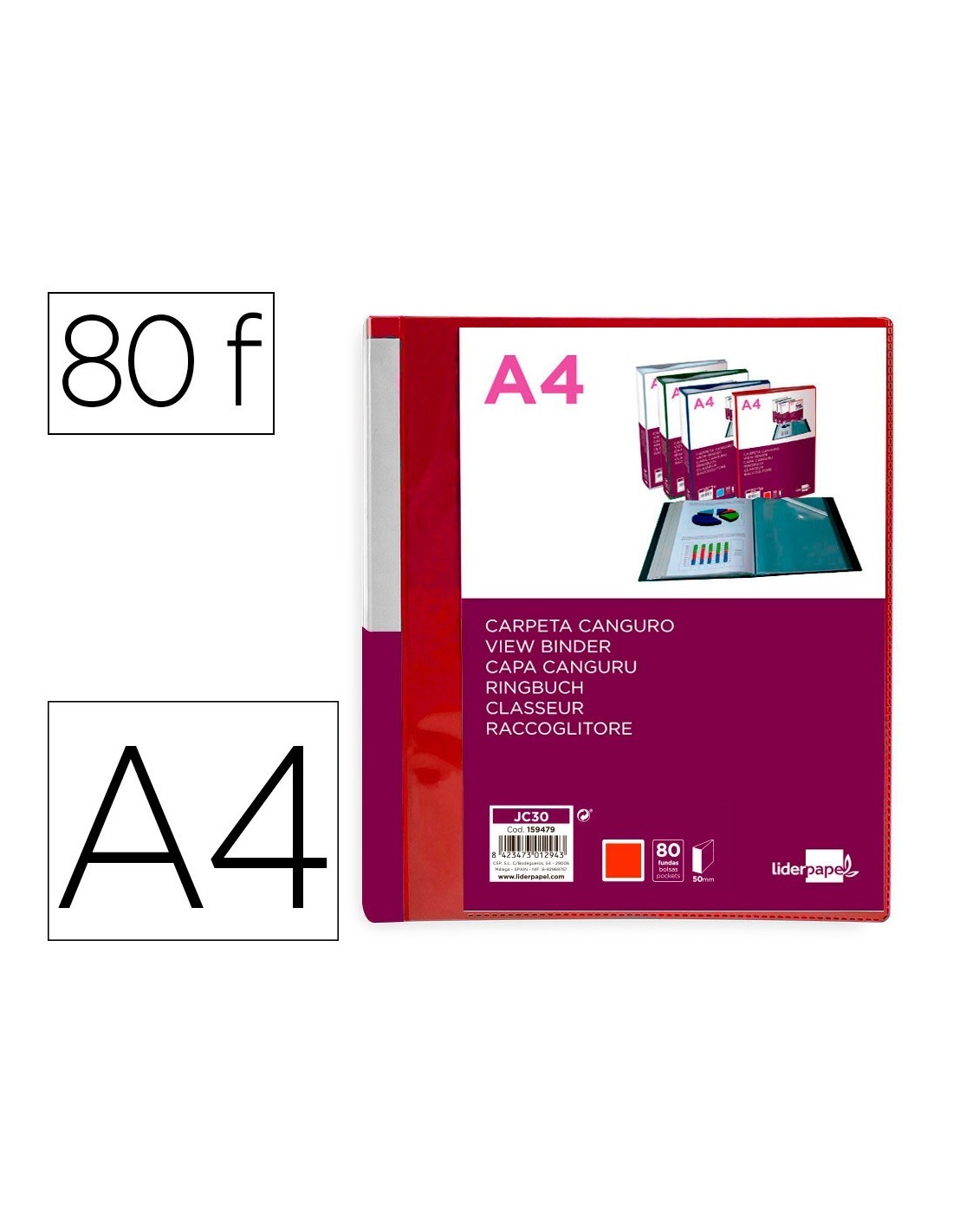 CARPETA LIDERPAPEL 80 FUNDAS CANGURO PP DIN A4 ROJO TRANSLUCIDO PORTADA Y LOMO PERSONALIZABLE