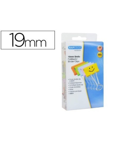 PINZA METALICA RAPESCO REVERSIBLE 19 MM SONRISAS COLORES SURTIDOS CAJITA DE 80 UNIDADES