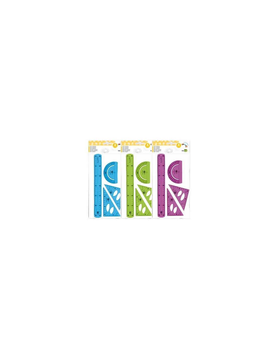 JUEGO ESCUADRA 10 CM CARTABON 14 CM REGLA 30 CM Y SEMICIRC. PLASTICO FLEXIBLE EN PETACA LIDERPAPEL COLORES SURTIDOS