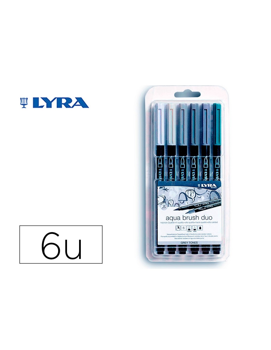 ROTULADOR LYRA AQUA BRUSH ACUARELABLE DOBLE PUNTA Y PINCEL TONOS GRISES BLISTER DE 6 UNIDADES SURTIDAS