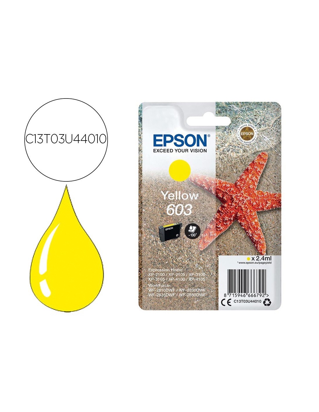 INK-JET EPSON 603 XP-2100 / 2105 / 3100 / 4100 / WF-2810 / 2830 / 2835 / 2850 AMARILLO 130 PAGINAS