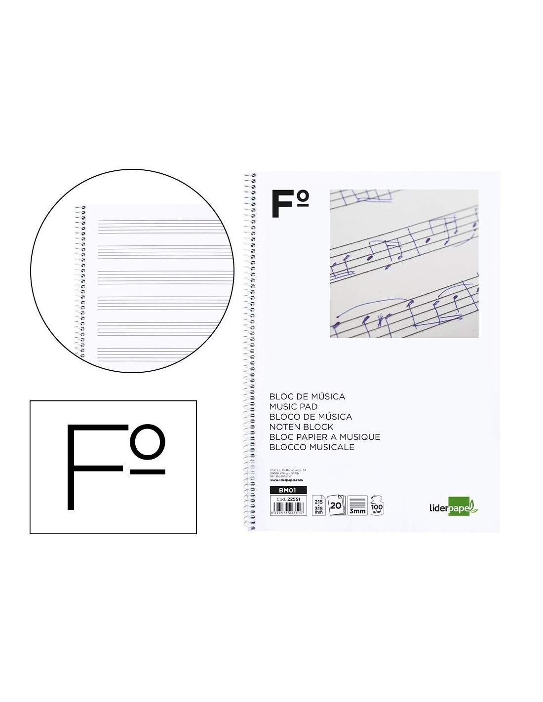 BLOC MUSICA LIDERPAPEL PENTAGRAMA 3MM FOLIO 20 HOJAS 100G/M2