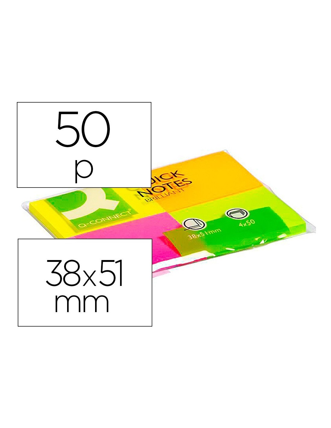 BLOC DE NOTAS ADHESIVAS QUITA Y PON Q-CONNECT 38X51 MM CON 50 HOJAS FLUORESCENTES PACK DE 4 UNIDADES