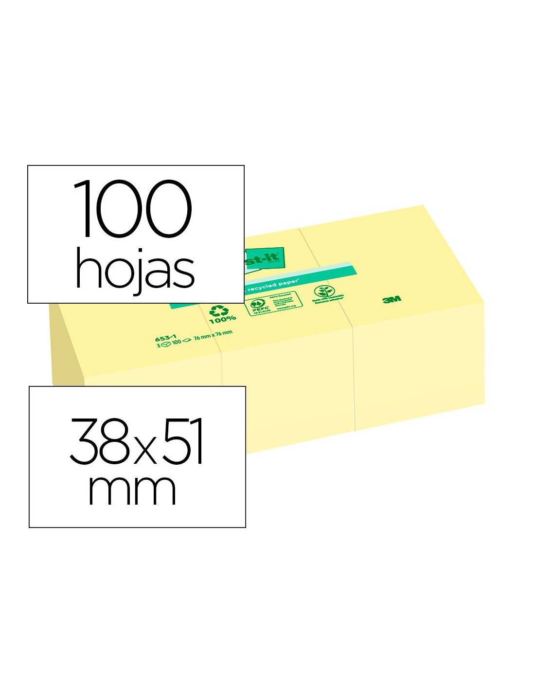 BLOC DE NOTAS ADHESIVAS QUITA Y PON POST-IT 38X51 MM PAPEL RECICLADO AMARILLO PACK DE 3 BLOCS 653-1