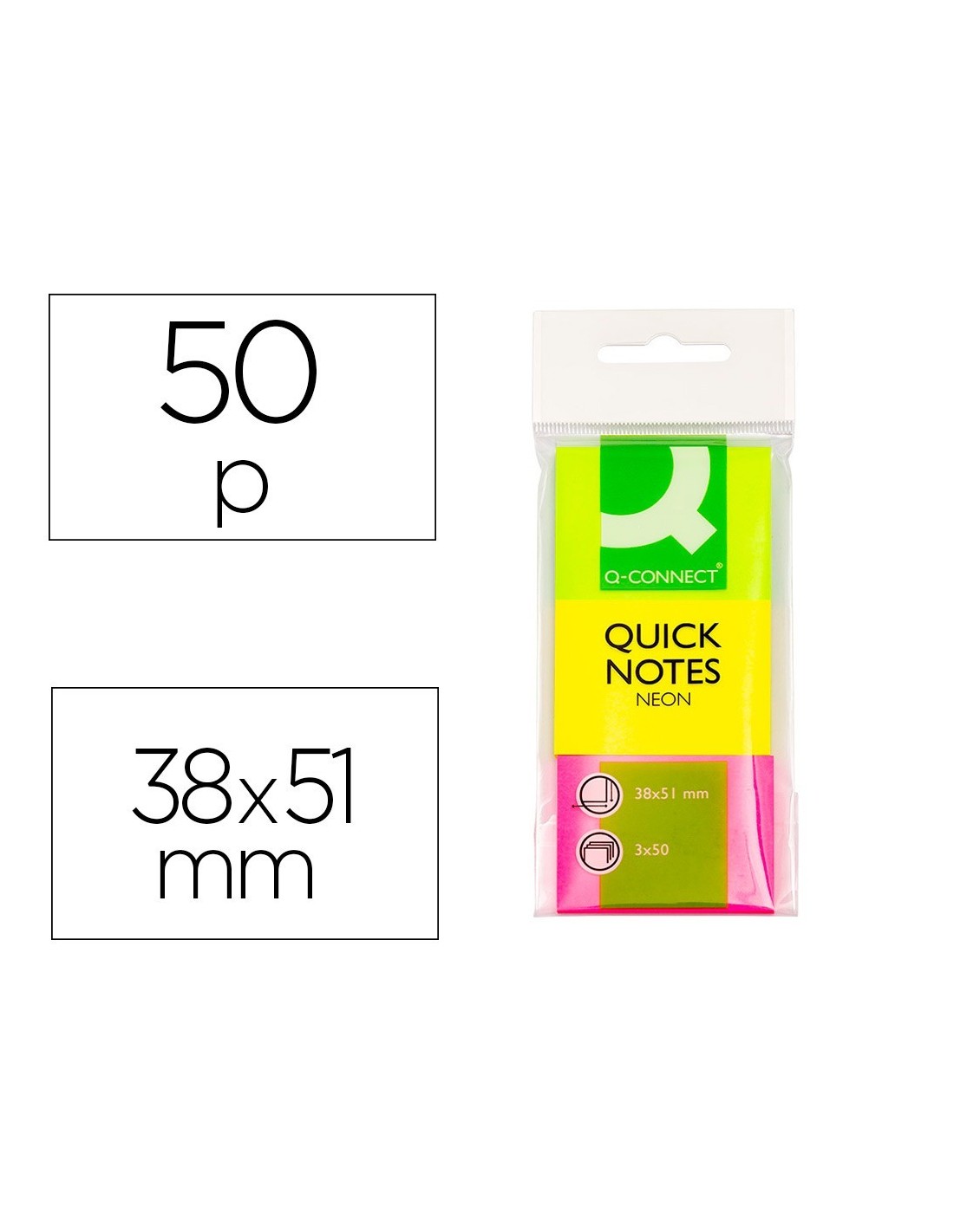 BLOC DE NOTAS ADHESIVAS QUITA Y PON Q-CONNECT 38X51 MM NEON PACK DE 3 UNIDADES CON 50 HOJAS POR COLOR