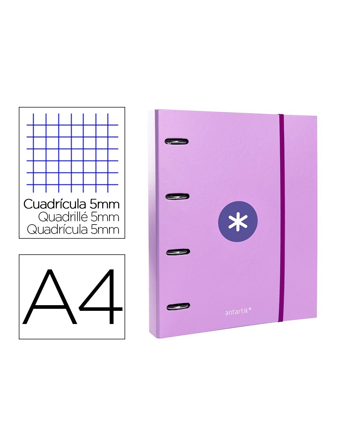 CARPETA CON RECAMBIO Y SOLAPA LIDERPAPEL ANTARTIK A4 CUADRO 5MM FORRADA 4 ANILLAS REDONDAS 40MM COLOR LAVANDA