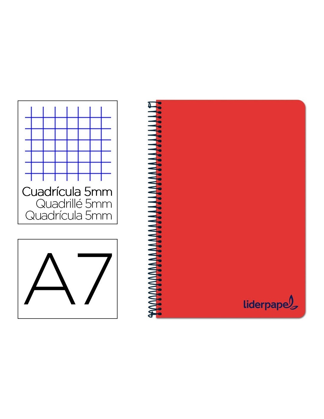 CUADERNO ESPIRAL LIDERPAPEL A7 MICRO WONDER TAPA PLASTICO 100H 90 GR CUADRO 5MM 4 BANDAS COLOR ROJO