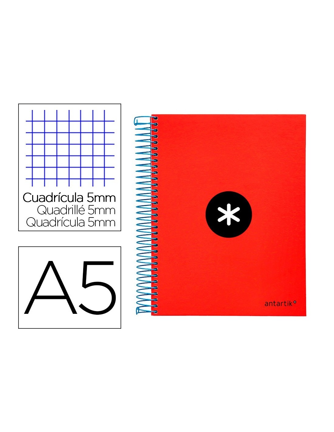 CUADERNO ESPIRAL LIDERPAPEL A5 MICRO ANTARTIK TAPA FORRADA120H 100 GR CUADRO 5MM 5 BANDAS 6 TALADROS COLOR ROJO