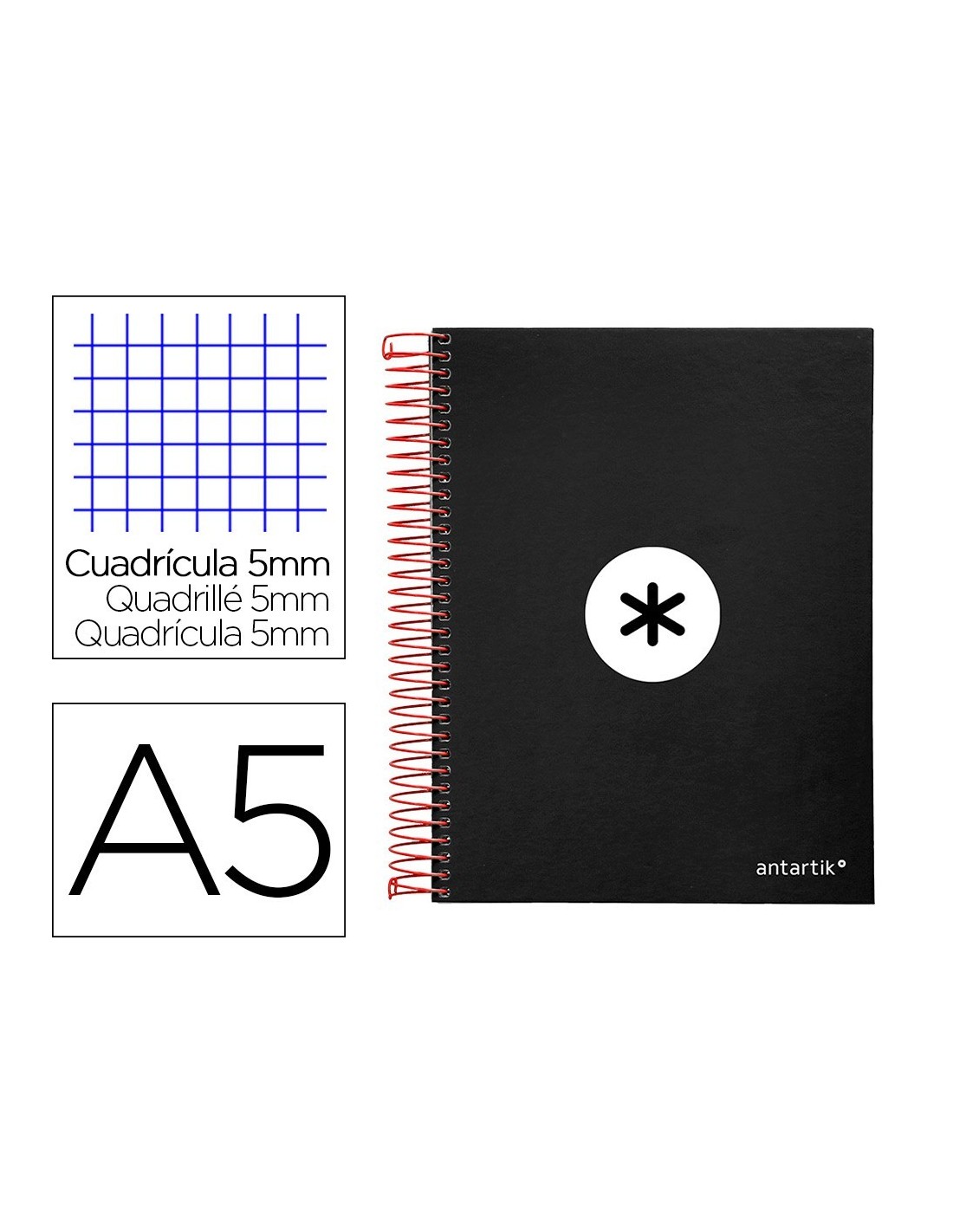 CUADERNO ESPIRAL LIDERPAPEL A5 MICRO ANTARTIK TAPA FORRADA120H 100 GR CUADRO 5MM 5 BANDAS 6 TALADROS COLOR NEGRO