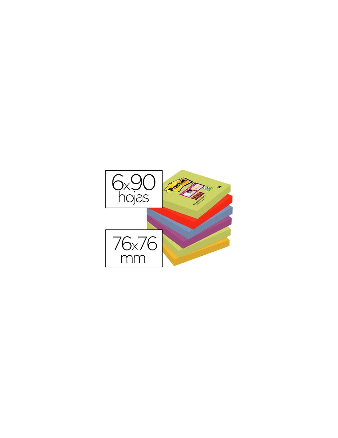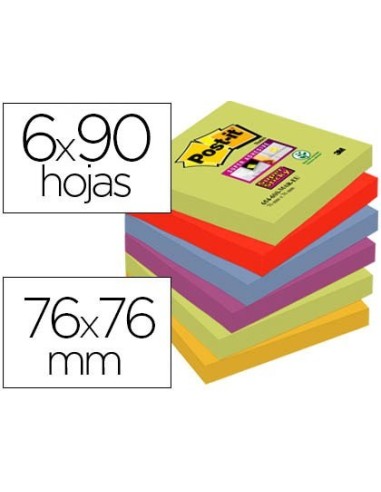 BLOC DE NOTAS ADHESIVAS QUITA Y PON POST-IT SUPER STICKY 76X76 MM CON 90 HOJAS PACK DE 6 BLOC COLORES SURTIDOS