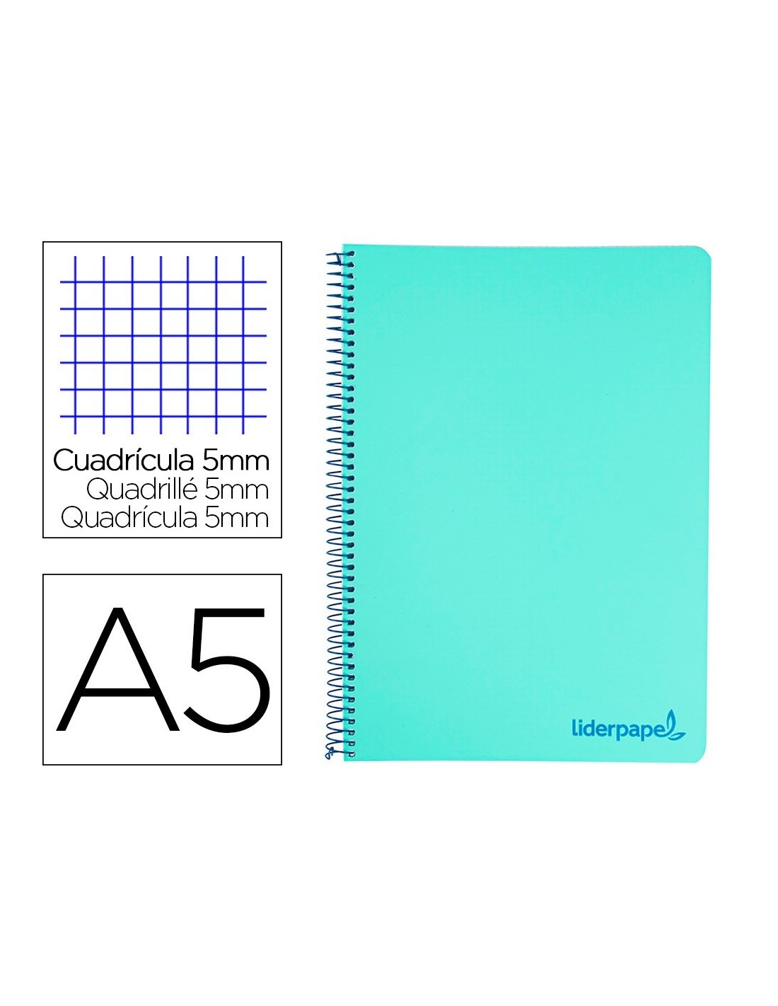 CUADERNO ESPIRAL LIDERPAPEL A5 MICRO WONDER TAPA PLASTICO 120H 90G CUADRO 5MM 5 BANDAS 6 TALADROS COLOR VERDE