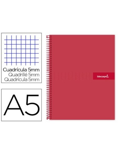 CUADERNO ESPIRAL LIDERPAPEL A5 MICRO CRAFTY TAPA FORRADA 120H 90 GR CUADRO 5MM 5 BANDAS6 TALADROS COLOR ROJO
