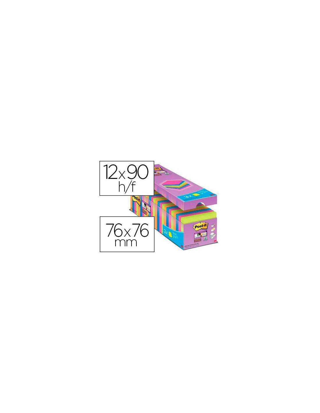 BLOC DE NOTAS ADHESIVA QUITA Y PON POST-IT SUPER STICKY 76X76 MM 90 HOJAS COLORES SURTIDOS PACK DE 21 + 3