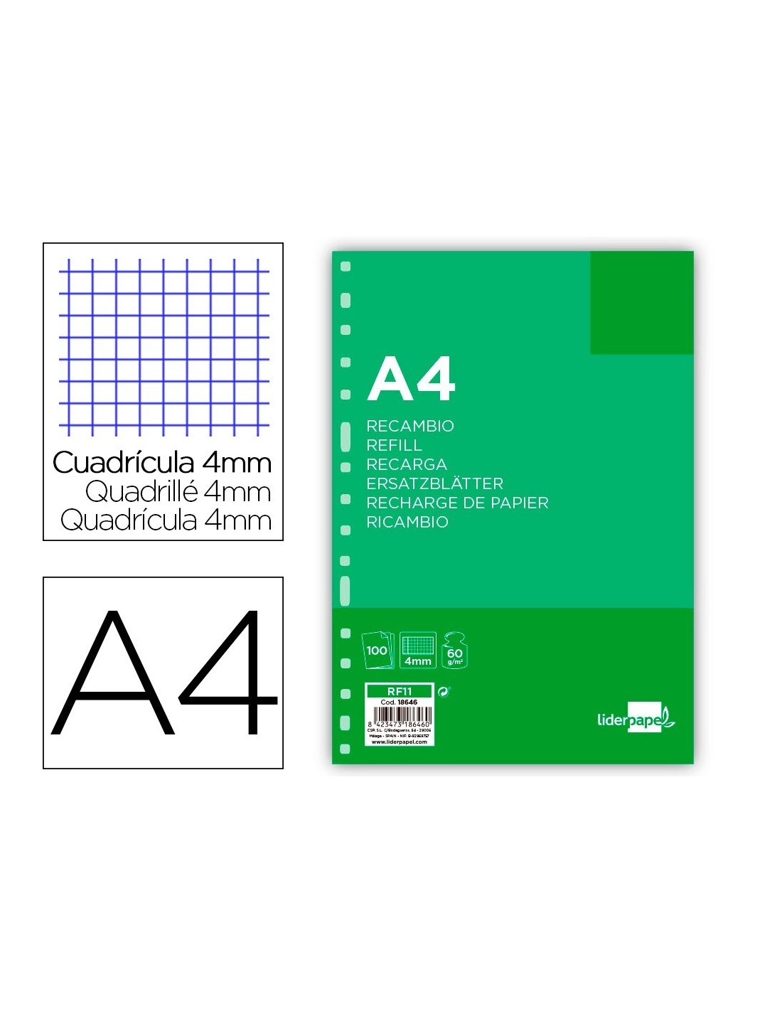 RECAMBIO LIDERPAPEL A4 100 HOJAS 60G/M2 CUADRO 4 MM CON MARGEN 16 TALADROS