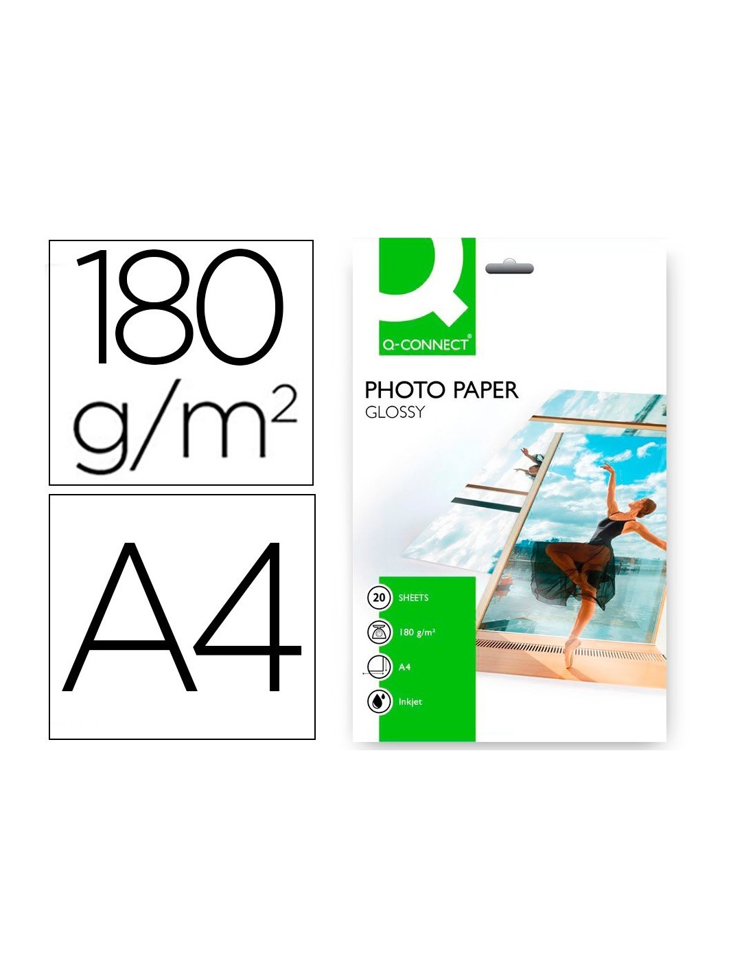 PAPEL Q-CONNECT FOTO GLOSSY KF01103 DIN A4 DIGITAL PHOTO PARA INK-JET BOLSA DE 20 HOJAS DE 180 GR