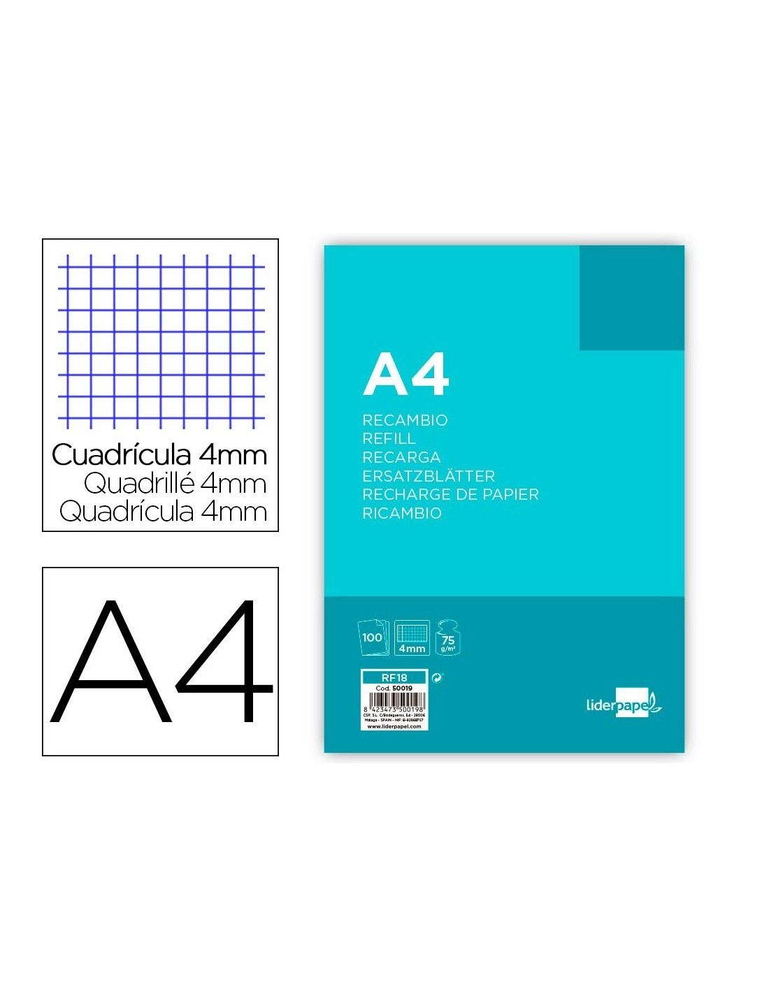 RECAMBIO LIDERPAPEL A4 100 HOJAS 75G/M2 CUADRO 4MM CON MARGEN 4 TALADROS