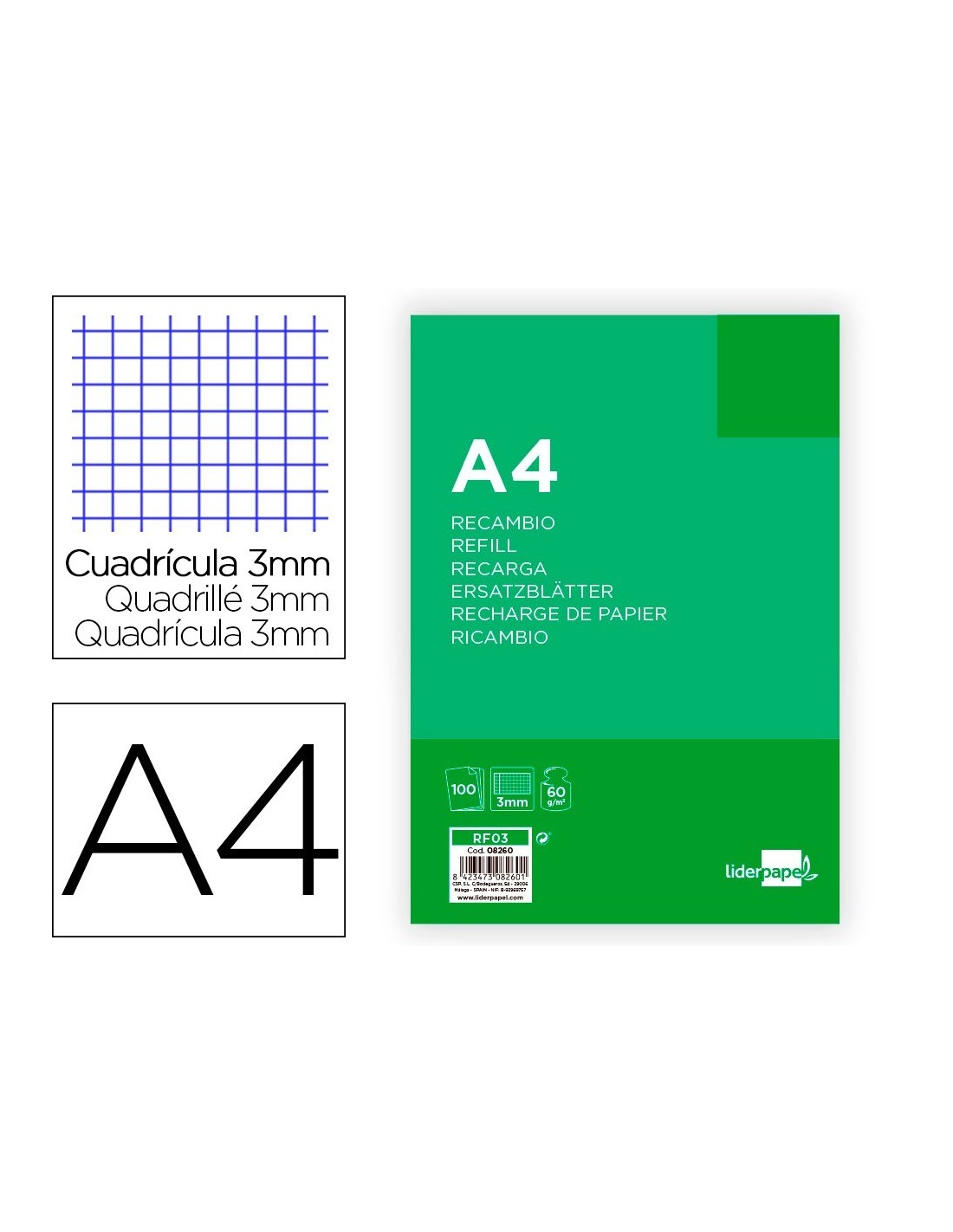 RECAMBIO LIDERPAPEL A4 100 HOJAS 60G/M2 CUADRO 3 MM CON MARGEN 4 TALADROS