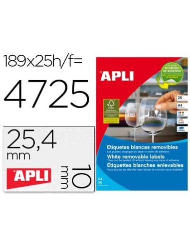 ETIQUETA ADHESIVAS APLI 10198 TAMAÑO 25,4X10 MM REMOVIBLE PARA FOTOCOPIADORA LASER INK-JET CAJA 25 HOJAS CON