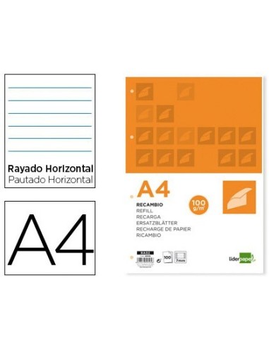 RECAMBIO LIDERPAPEL A4 100 HOJAS 100 G/M2 RAYADO HORIZONTAL CON MARGEN 4 TALADROS