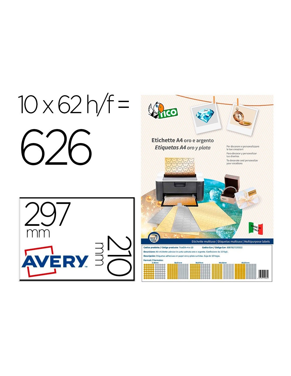 ETIQUETA ADHESIVA AVERY TICO PAPEL SATINADO ORO / PLATA LASER MEDIDAS SURTIDAS PACK DE 626 ETIQUETAS