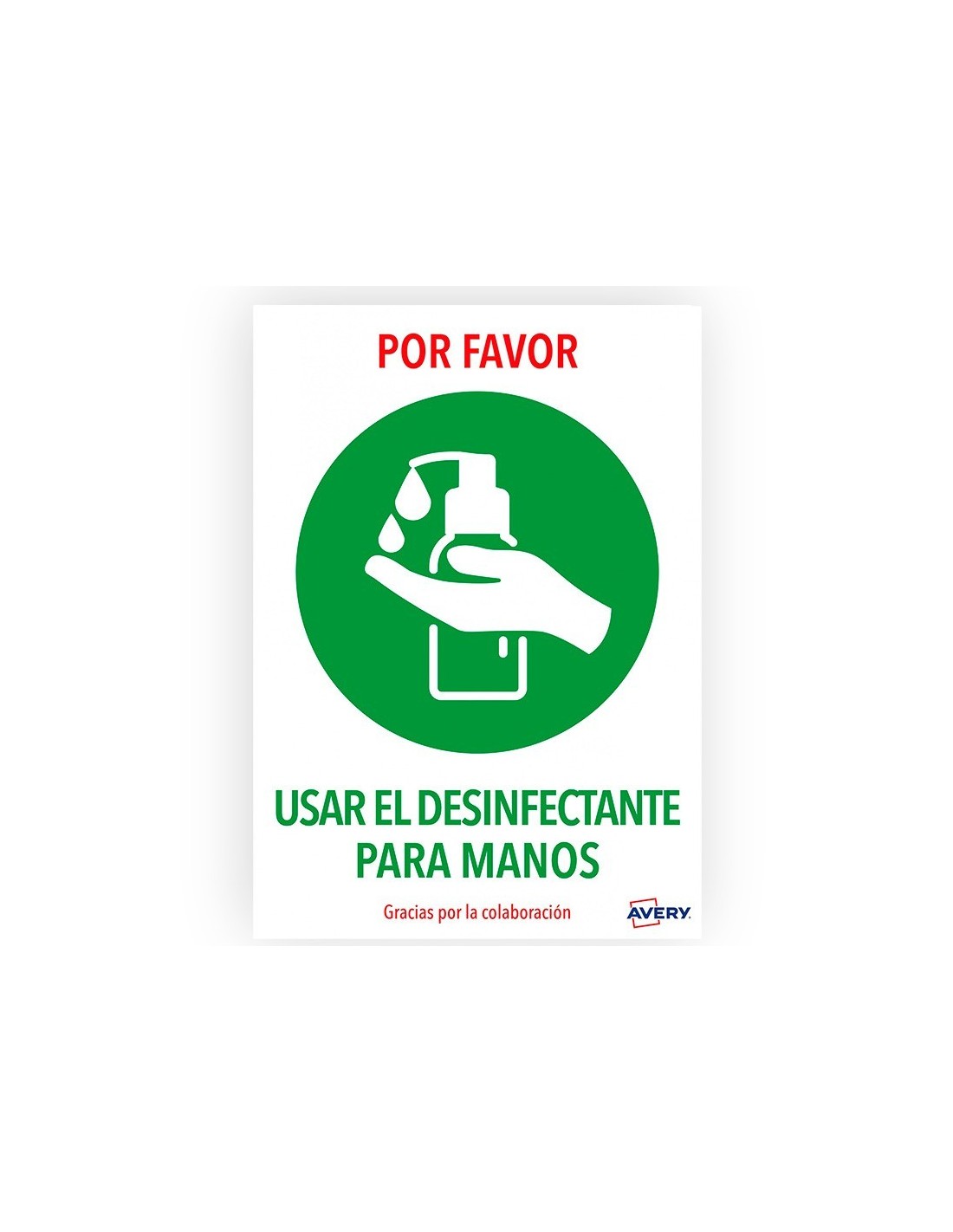 SEÑAL ADHESIVA AVERY USAR EL DESINFECTANTE PARA LAS MANOS DIN A4 RESISTENTE A LOS RAYOS UV PACK DE 2 UNIDADES